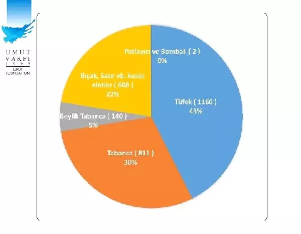"2015 yılında meydana gelen bireysel silahlı olayların yüzde 71'inde tüfek, tabanca ve beylik silahı gibi ateşli silahlar, yüzde 29'unda ise kesici ve delici aletler kullanıldı. 2016 yılında ise 2 bin 720 bireysel silahlı olay ulusal ve yöresel medyaya yansıdı. Bu olaylarda, 2 bin 57 kişi öldü, bir kısmı ağır bin 961 kişi de yaralandı. İstatistiklere bakıldığında; 2016 yılında şiddet olaylarında ateşli silahların kullanımında önceki yıla göre yüzde 7'lik bir artış dikkat çekiyor. 2016 yılında olayların yüzde 78'inde ateşli silahlar (Yani yüzde 43'ünde kalaşnikof dahil uzun namlulu silahlar, yüzde 30'unda tabancı ve yüzde 5'inde de beylik silahları kullanılmış), yüzde 22'sinde ise çoğunluğu bıçak olmak üzere satırdan baltaya kesici aletler kullanıldı.