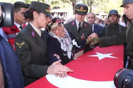 Şehidin annesi cenaze töreninde güçlükle ayakta durabilmişti.