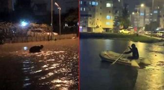 Şiddetli yağmur sokağı göle çevirdi, botunu kapan vatandaş denizde yüzer gibi yüzdü