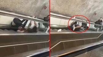 Metroda pes dedirten kavga! Yürüyen merdivenlerden yuvarlansalar da ayrılmadılar