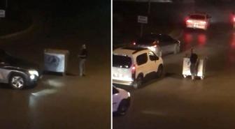 Çöp kovasını yol ortasına çekerek içki masası olarak kullanan şahıs, sürücüleri çileden çıkardı