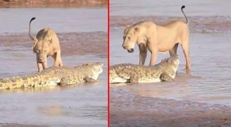 Timsah ve aslan sığ suda karşı karşıya geldi! İşte doğanın iki kabadayısının kavgası