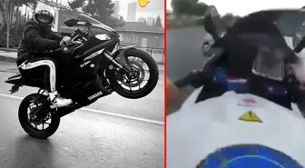 Motosikletle tek teker üzerinde gitmeye çalışırken kaza yapan sürücünün son anları kamerada