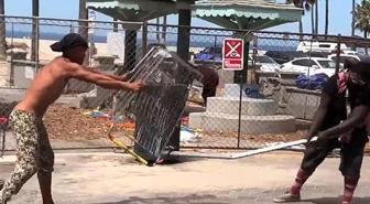 İki evsiz, alışveriş arabası ve metal direkle birbirine girdi! Çevredekiler film izler gibi izledi