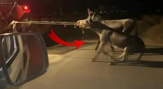 Vicdansız sürücü, traktörün arkasına bağladığı eşekleri sürükleyerek böyle götürdü
