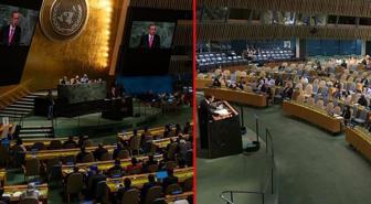 BM Genel Kurulu'nda Cumhurbaşkanı Erdoğan hitap ederken dolu olan koltuklar, Macron konuşurken boş kaldı