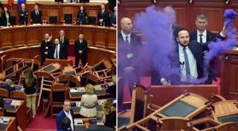 Arnavutluk Meclisinde büyük kavga! Oturumu engelleyen muhalefet milletvekilleri kürsüye sis bombası attı