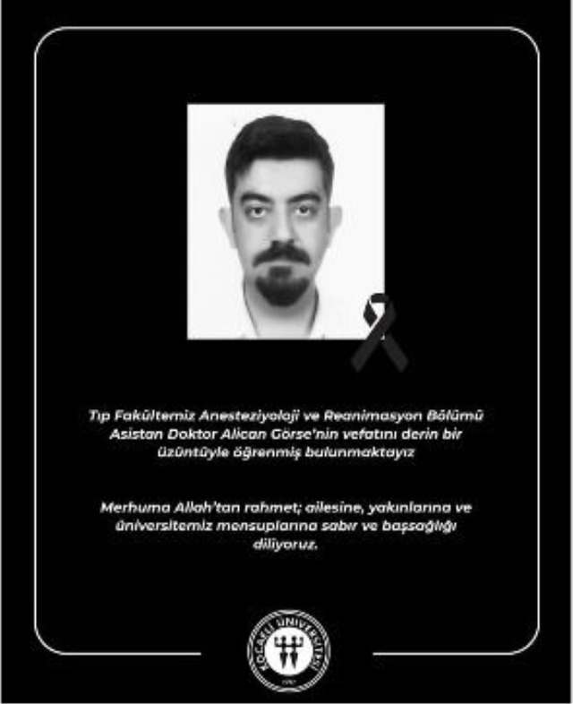 “Tıp Fakültemiz Anesteziyoloji ve Reanimasyon Bölümü Asistan Doktor Alican Görse’nin vefatını derin bir üzüntüyle öğrenmiş bulunmaktayız. Merhuma Allah’tan rahmet; ailesine, yakınlarına ve üniversitemiz mensuplarına sabır ve başsağlığı diliyoruz”