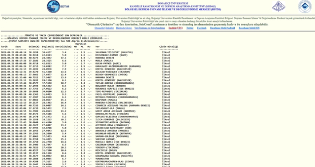 KANDİLLİ SON DEPREMLER LİSTESİ