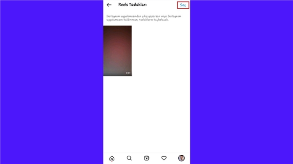 Reels taslakları için ise profilinize girerek Reels sekmesine girin. Burada daha önceden kaydedilmiş Reels videolarını görebilirsiniz. Aynı şekilde yeniden paylaşabilir veya dilerseniz sağ üst köşedeki Seç ifadesine tıklayarak kalıcı olarak silebilirsiniz.