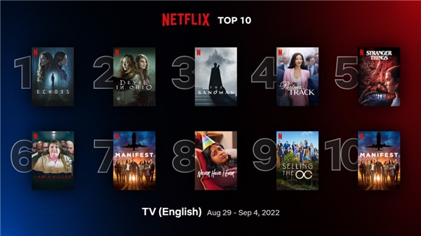 # TV (İngilizce) Kaç haftadır Top10 listesinde Toplam izlenme (saat) 1 Echoes 3 36 milyon 580 bin 2 Devil in Ohio 1 35 milyon 370 bin 3 The Sandman: 1. sezon 5 33 milyon 320 bin 4 Partner Track: 1. sezon 2 31 milyon 140 bin 5 Stranger Things 4 15 20 milyon 280 bin 6 I AM A KILLER: 3. sezon 1 17 milyon 920 bin 7 Manifest: 1. sezon 18 16 milyon 410 bin 8 Never Have I Ever: 3. sezon 4 14 milyon 820 bin 9 Selling The OC: 1. sezon 2 13 milyon 670 bin 10 Manifest: 3. sezon 7 11 milyon 930 bin