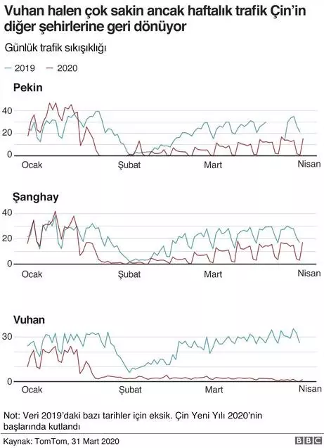 Aralık ayında koronavirüs salgınının ilk kez görüldüğü Vuhan kentinde ise trafiğin halen sıfır seviyesine yakın seyrettiği görülebiliyor.