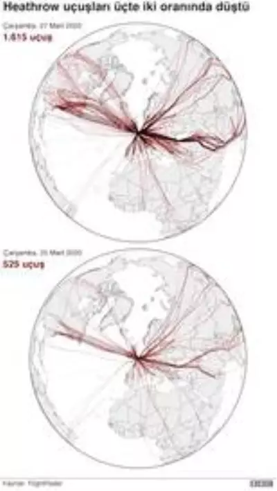 Mart ayı sonunda dünyanın en büyük havalimanlarında hava trafiğinin önemli ölçüde gerilediği görüldü. Mart ayının son haftasında geçen yılın aynı dönemine kıyasla hava trafiği yüzde 63 azaldı.