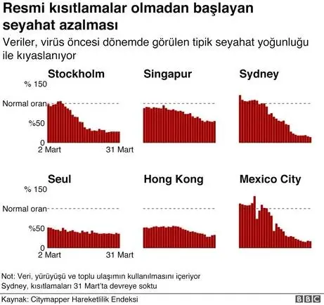 Mesela Brezilya'nın en büyük şehri Sao Paulo'da 24 Mart'ta seyahat kısıtlamaları devreye girse de bu tarihten daha önce ulaşımın azaldığı görüldü.
