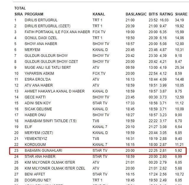Çarşamba günleri reyting birinciliğini kimseye kaptırmayan Diriliş Ertuğrul bu hafta da birinci oldu. "Ertuğrul'a rakip olacak" denilen dizi Babamın Günahları reytinglerde 23. sırafa kalarak çok kötü bir başlangıç yaptı. Dizinin erken final yapma ihtimali şimdiden başladı.
