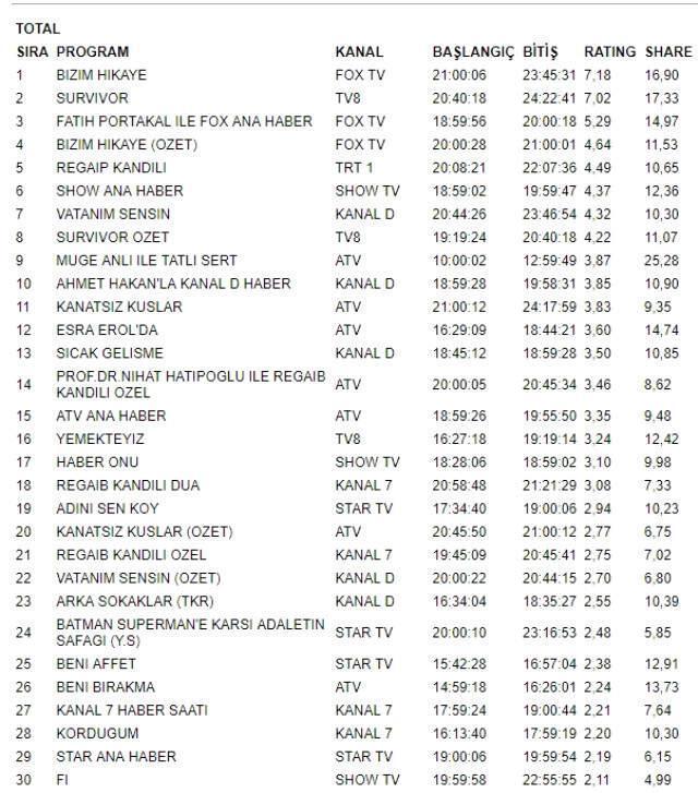 Perşembe günü reyting sonuçlarında Fi, 30. sırada yer alarak resmen çakıldı. Fi'nin internetteki gibi başarılı olacağı düşünülürken televizyon ekranlarında dibi gördü. Reyting birincisi ise FOX TV'de yayınlanan Bizim Hikaye oldu.