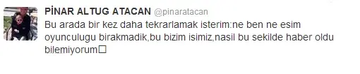 Altuğ, Twitter'da "Tekrarlamak isterim: Ne ben, ne eşim oyunculuğu bırakmadık. Bu bizim işimiz. Nasıl bu şekilde bir haber çıktı bilemiyorum" diye yazdı.