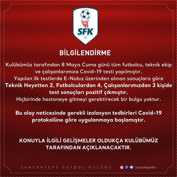 Kulübün Twitter hesabında yer alan açıklamada, "Kulübümüz tarafından 8 Mayıs Cuma günü tüm futbolcu, teknik ekip ve çalışanlarımıza Kovid-19 testi yapılmıştır. Yapılan ilk testlerde E-Nabız üzerinden alınan sonuçlara göre teknik heyetten 2, futbolculardan 4, çalışanlarımızdan 3 kişide test sonuçları pozitif çıkmıştır." ifadelerine yer verildi.
