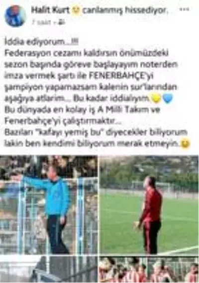 Sosyal medya hesabından açıklama yapan Kurt, "İddia ediyorum Federasyon cezamı kaldırsın, önümüzdeki sezon başında göreve başlayayım noterde imza vermek şartı ile Fenerbahçe'yi şampiyon yapamazsam kalenin surlarından aşağıya atlarım. Bu kadar iddialıyım. Bu dünyada en kolay iş A Milli Takım ve Fenerbahçe'yi çalıştırmaktır. Bazıları 'Kafayı yemiş bu' diyecekler biliyorum. Lakin ben kendimi biliyorum merak etmeyin." ifadelerini kullandı.