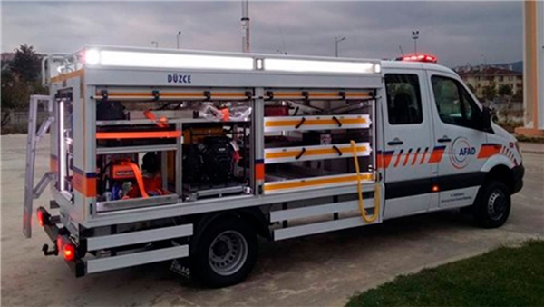 Özel tasarımlı karoserinde hidrolik ve şarjlı kesme ayırma takımları, jeneratörler, beton kırıcılar, çok amaçlı kesiciler, sesli ve görüntülü arama cihazları, kaldırma yastıkları, aydınlatma setleri gibi ekipmanlar barındırıyor. Araçlar, karoserinin üzerinde yükseltilebilen aydınlatma direkleri ile önünde ise bir vinç ile destekleniyor. Çift kabinli oturma alanıyla, 7 personelin aynı anda olay yerine intikal etmesini de mümkün kılıyor.
