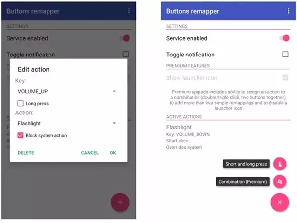 Buttons Remapper'da tıpkı Button Mapper gibi kısa ve uzun basmaları destekliyor ancak Button Mapper'ın aksine çift dokunuşu desteklemiyor. Ancak Button Mapper'ın aksine bu uygulama hem yazılım hem de donanım tuşlarına erişim sağlayabiliyor.