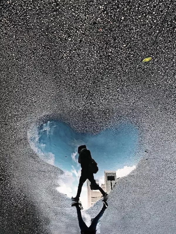 Sebastien Marineau-Mes fotoğraf hakkında şunları söylüyor: "Kalp şeklindeki su birikintisinin konuyu çerçevelendirme şeklini seviyorum. Konu aceleyle yürüdüğü için dünyaya bir bakış atıyor."