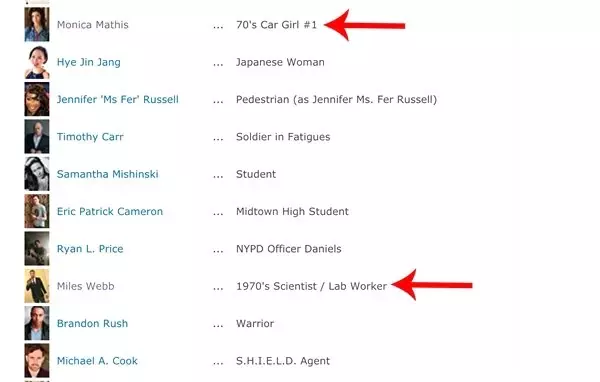 Karakterlerden ikisi de 1970'li yıllarda geçmesi muhtemel sahnelerde oynamışlar gibi "70'lerin Araba Kızı" ve "1970'lerin Bilim İnsanı" şeklinde isimlendirilmiş. Her iki oyuncunun da bireysel IMDb profillerine baktığımızda, daha önce büyük çaplı projelerde yer almadıklarını görüyoruz. Hatta 2'şer 3'er projede isimleri geçiyor. Bu da filme çok etki etmeyeceklerini kanıtlıyor. Anlaşılan o ki 70'li yıllarda geçecek muhtemel sahnelerde öylece görünecekler.
