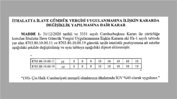İthalatta İlave Gümrük Vergisi uygulamasında Çin menşeili elektrikli araçlar için ilave gümrük vergisi belirlendi.