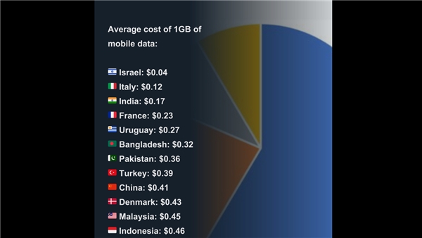 Ülke1GB Mobil Verinin Ortalama Maliyetiİsrail$0.04İtalya$0.12Hindistan$0.17Fransa$0.23Uruguay$0.27Bangladeş$0.32Pakistan$0.36Türkiye$0.39Çin$0.41Danimarka$0.43Malezya$0.45Endonezya$0.46Rusya$0.48Kolombiya$0.49Avusturalya$0.57İspanya$0.60Nijerya$0.71Brezilya$0.74İngiltere$0.79Avusturya$0.94İzlanda$1.01Estonya$1.20Arjantin$1.48Suudi Arabistan$1.52İsveç$1.88Hollanda$1.90Güney Afrika$2.04Venezuela$2.22Almanya$2.67Meksika$2.89Portekiz$3.67Japonya$3.85Norveç$4.44Amerika Birleşik Devletleri$5.62Kanada$5.94Finlandiya$6.01İsviçre$7.37Güney Kore$12.55Malvinas Adaları$38.45