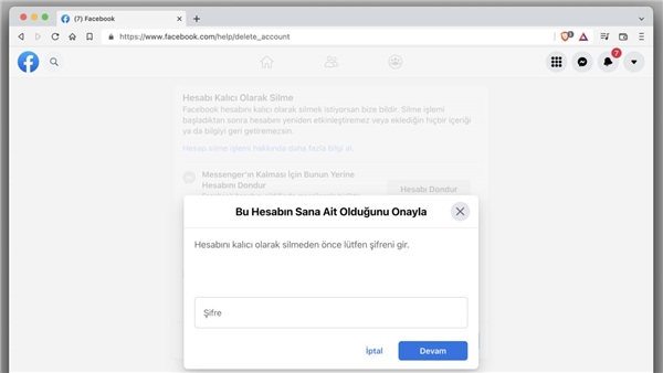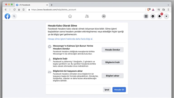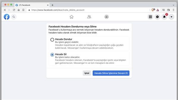 Önemli uyarı: Facebook silme hesabınızın geri dönüşü olmayan bir şekilde kapatılmasına, tüm arkadaş listenizin ve paylaşımlarınızın kaybolmasına neden olacak. Eğer hesabı silmek yerine geçiçi olarak kapatmak istiyorsanız, aşağıdaki linke tıklayarak Facebook dondurma işlemini gerçekleştirebilirsiniz.
