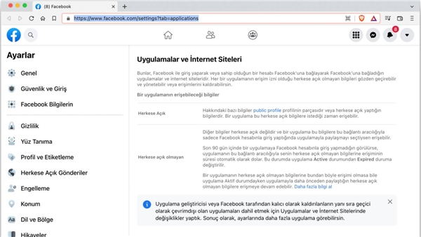Buraya tıklayarak Uygulamalar ve İnternet Siteleri sayfasına ulaşabilir ve Facebook ile giriş yaptığınız uygulamaların listesine ulaşabilirsiniz.