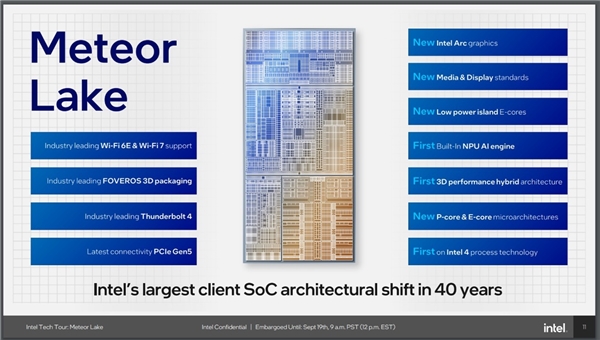 Meteor Lake ailesi Intel için yeni bir döneme işaret ediyor. TSMC'nin yolundan giden Intel, bu konuda Intel 4 işlem teknolojisini kullanacak. Meteor Lake ailesinde dört ayrı yonga (Intel, "karo" ifadesini kullanıyor) bulunacak. Bunlar CPU çekirdekleri, entegre grafik belleği (GPU), I/O ve sistem özellikleri olarak ayrı bölümlerde çalışacak.
