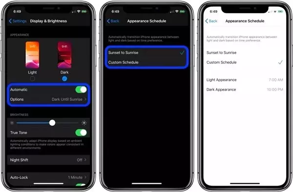Android'e karanlık modun Android Q ile gelmesi bekleniyor. Ancak Android Q için bahsedilen karanlık modun aksine iOS 13, karanlık modu otomatik açılıp kapanma seçeneğiyle getiriyor. Telefonunuzun ne zaman karanlık moda ne zaman normal moda gireceğini belirleyebiliyorsunuz.