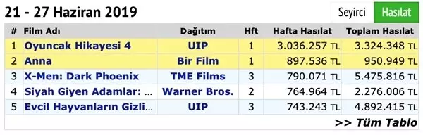 Oyuncak Hikayesi serisinin dördüncü filmi, bu haftayı da lider olarak kapattı.