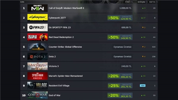 Steam tarafından paylaşılan en çok satan oyunlar listesinin ilk sırasında Call of Duty serisinin yeni çıkan, fakat ön sipariş dönemindeyken de satış rekoru kıran oyunu oldu. Hemen arkasında ise yüzde 50 indirime girdiği için tekrar yükselişe geçen Cybetpunk 2077 buluyor.
