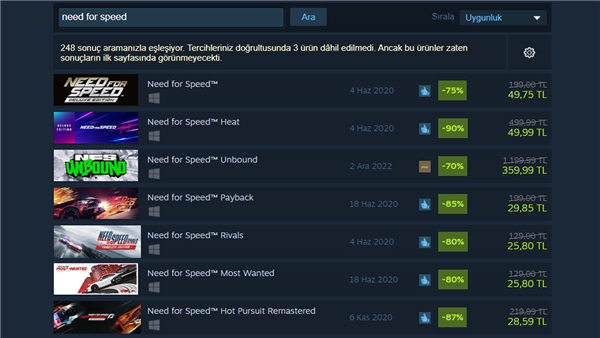 Dilerseniz buradan ulaşabileceğiniz Steam sayfasında indirime giren tüm Need for Speed oyunlarını görebilirsiniz. Özellikle NFS Unbound, ilk çıktığı zaman oyunun karışık incelemelerine rağmen 1.200 TL fiyat etiketine sahip olmasından ötürü eleştirilmişti.