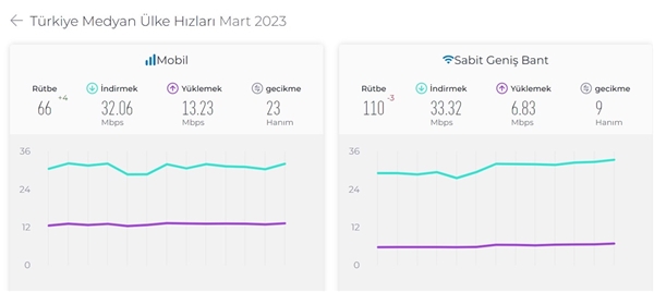 Speedtest'in sonuçlarına göre Türkiye'nin ortalama internet hız sonuçları gözler önüne serildi. Mobil internet indirme hızı 32.06 Mbps, yükleme hızı ise 13.23 Mbps olarak belirlendi. Gecikme ise 23 ms seviyesindeydi. Bu sonuçlar ile Türkiye, mobil internet sıralamasında 66. olmayı başardı.