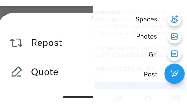 Bu hafta içinde önceki güncelleme, çeşitli uygulama kopyalarına, arama çubuklarına ve menüye "X" ekledi. Şimdi, X for Android, FAB'nin sağ alt köşesini açtığınızda gözüken "Tweet" ibaresini "Gönder" olarak değiştirdi. Dolayısıyla paylaşılan içeriklerin ismi de "gönderi" olmuş oldu. Bu gerçekten de keskin bir dönüş ve markanın ikonik halinden nasıl uzaklaştığının bir göstergesi daha oldu.