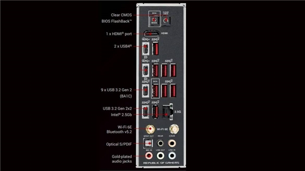 Görsele biraz daha yakından baktığımızda iki adet 40 Gbps USB 4.0 Type-C portu olduğunu görüyoruz. Buna ek olarak bir adet 20 Gbps USB 3.2 Type-C çıkışı bulunuyor. Ayrıca 8 adet USB 3.2 Type-A ve 1 adet USB 3.2 Type-C olmak üzere toplamda 9 çıkış daha var. Bu portlar ise en yüksek 10 Gbps hızını destekliyor.
