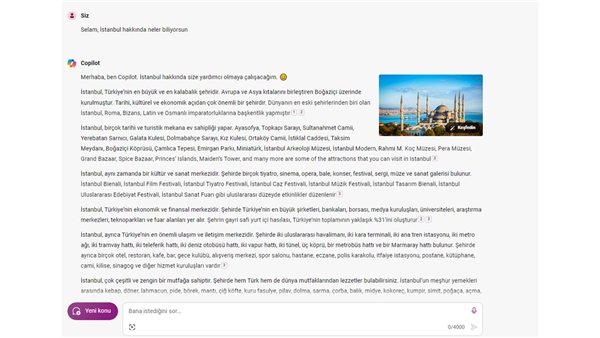 Copilot'a bilgisini arttırmasını ve bilgiye erişmesini istedim. Böylelikle resmi oluştururken daha detaylı oluşturabilecek. Şimdi de İstanbul hakkında fotoğraflar oluşturmasını istiyorum.