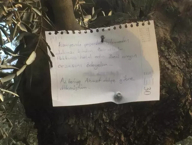Gemlik'te kamyonuyla zeytin ağacının dalını kıran sürücünün bıraktığı "İstemeden dalınızı kırdım. Özür dilerim. Hakkınızı helal edin. Beni arayın" yazılı not sosyal medyayı salladı.