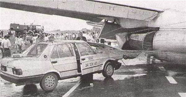 Yola doğru çıkan uçak o sırada oradan geçmekte olan 34 TJV 62 plakalı ticari taksiye çarptı. 90'lı yılları bilirsiniz Tofaş Kuş Grubu otomobiller ucuz değildi ve birçok ailenin hayali sayılırdı. Fakat oradan geçen talihsiz Tofaş Şahin taksi uçağın gazabına uğradı. Olayda ölen veya ağır yaralanan olmadı. Taksi ve taksinin müşterisi de hafif sıyrıklar ile kurtuldu. Tofaş pert olurken, yaşlı 707'nin iniş takımları kırıldı. Olayın ardından 05-23 pistinde tekrar bir düzenleme yapıldı. (Pistin o dönemki adı 06-24)