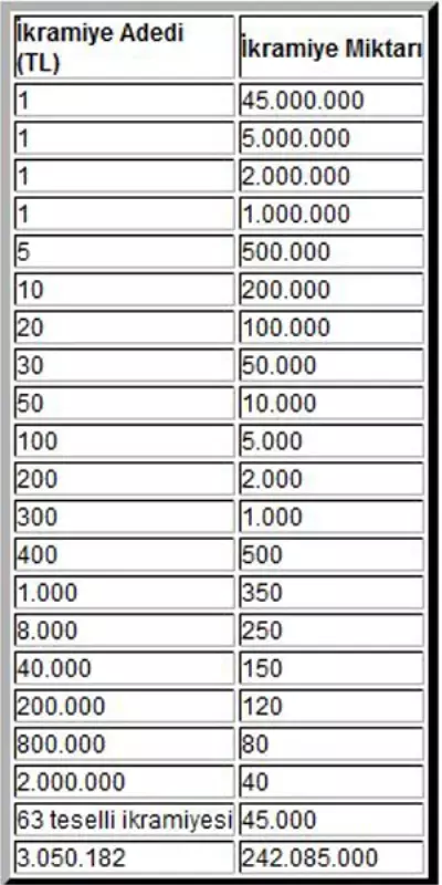 Böylece yılbaşı özel çekilişinde 3 milyon 50 bin 182 adet ikramiye dağıtılacak. Toplam ikramiye tutarı da 242 milyon 85 bin lira olacak.